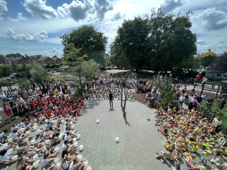 We werken toe naar een groot spektakel waar iedereen naar mag komen kijken. We beginnen in elke groep apart, maar uiteindelijk treden we met de hele school op: we maken één groot concert!